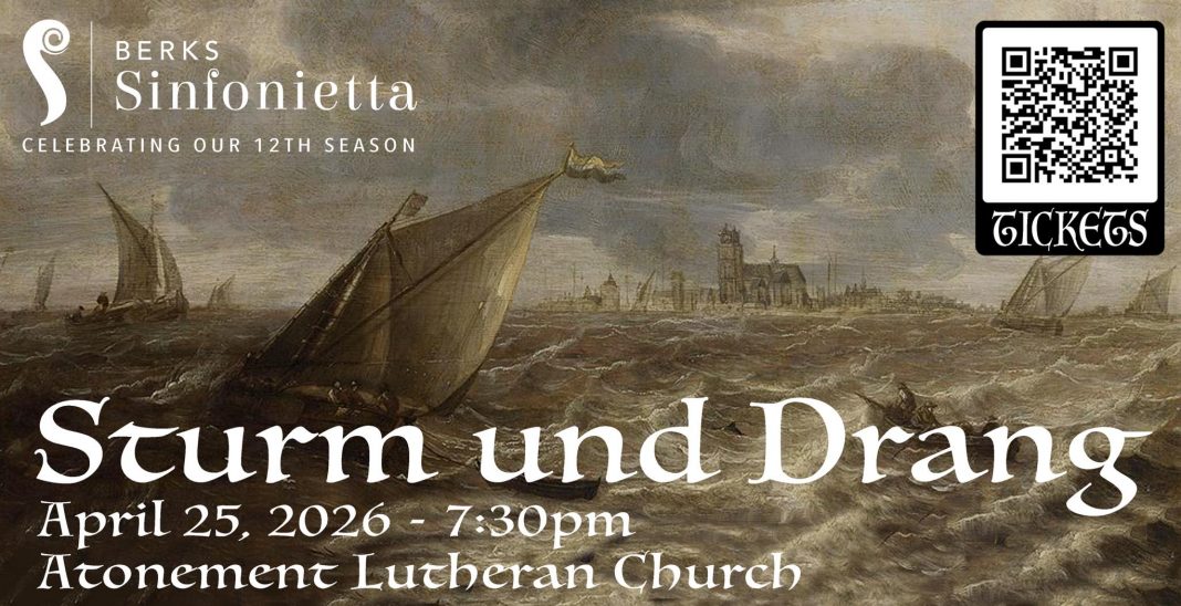 Join Berks Sinfonietta for “Sturm und Drang,” on Saturday, April 25, 2026 at 7:30 p.m. at Atonement Lutheran Church in Wyomissing, PA. Berks County’s homegrown orchestra explores the ‘storm & stress’ of Haydn’s Symphony No. 44 and other classical works.