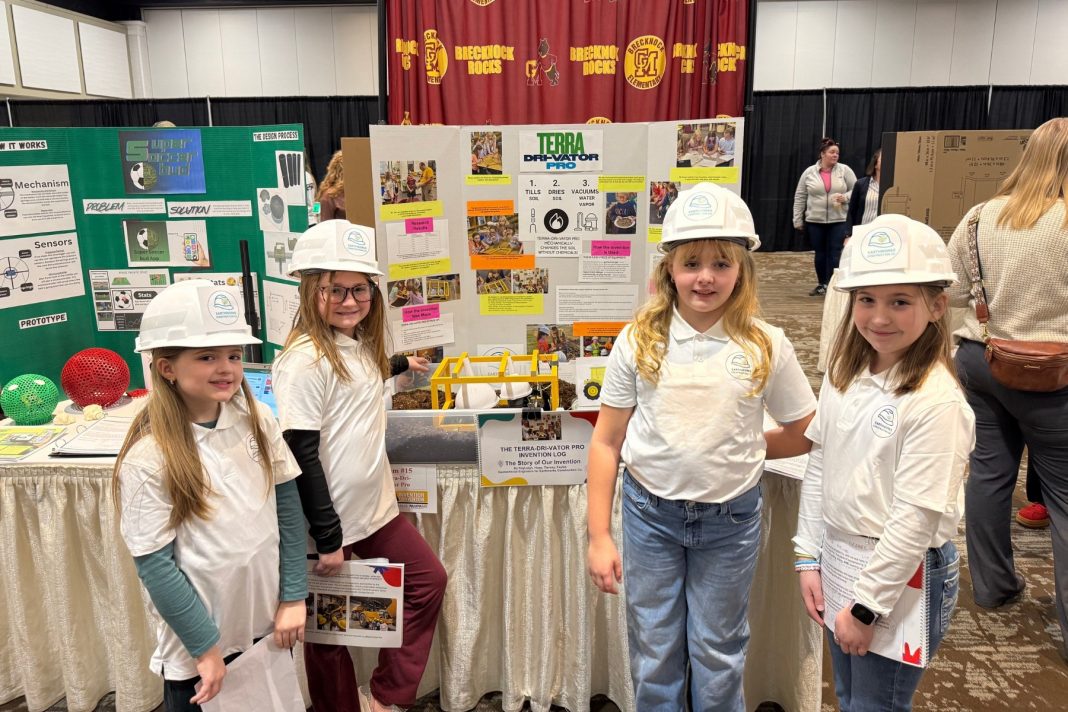 On Wednesday, February 4, 2026, Brecknock Elementary students KayLeigh Haage, Hope McCallicher, Tierney Sanocki, and Faylee Stitzman, led by Brecknock Elementary librarian Rachel Sebastian and classroom teacher Adam Ricketts, presented their prototype, the Terra-Dri-Vator Pro, at the PA Invention Convention’s state competition in Hershey, PA and took home first place in the elementary division. The group was among 56 others representing top scoring projects from regional and virtual qualifying events, 17 of which were competing in the elementary division.