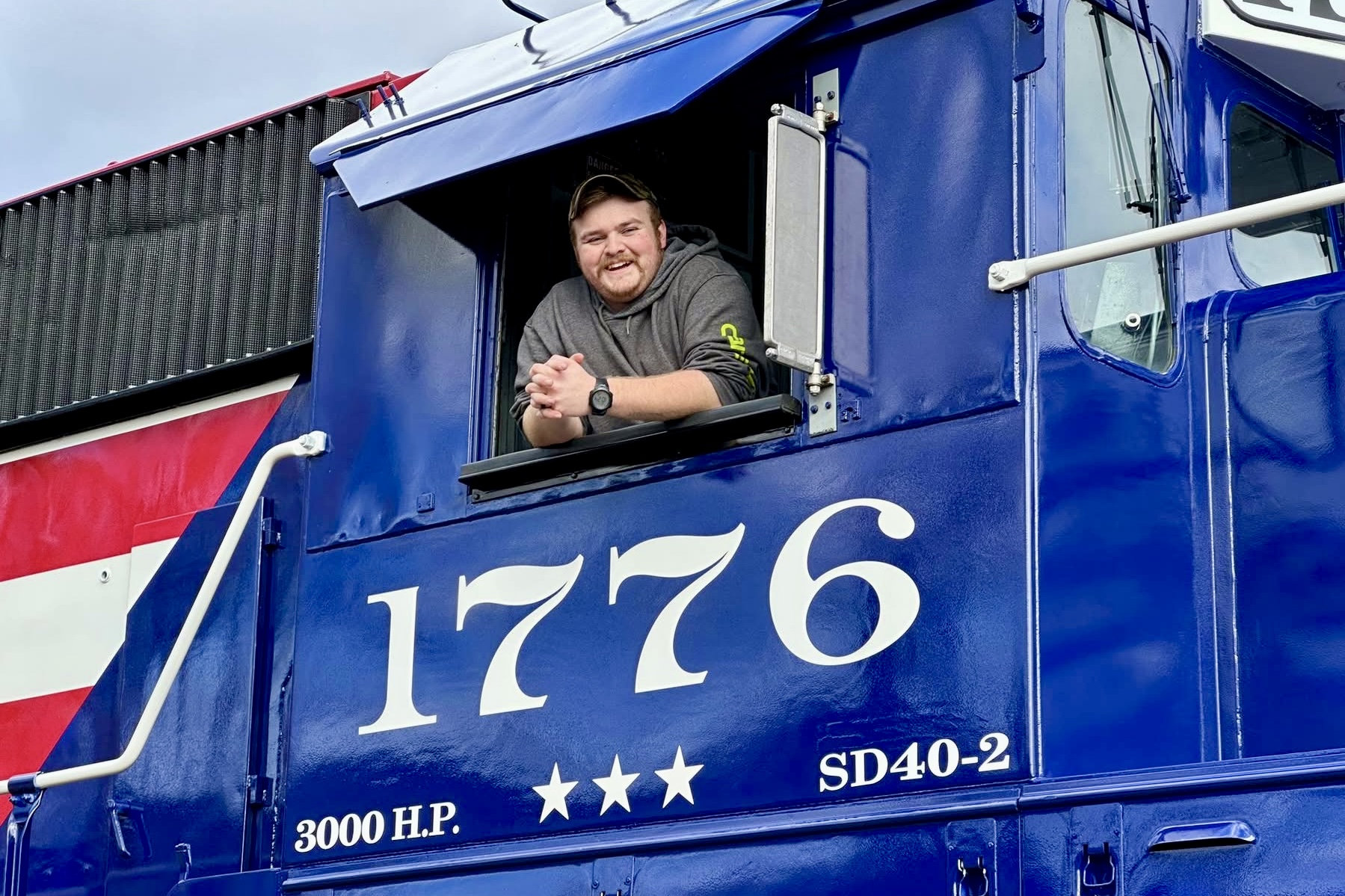 Reading & Northern engine #3061, a General Motors model SD40-2 diesel locomotive, was selected by the company to be repainted into the colors of our country to celebrate the coming year’s monumental occasion. Taking advantage of the car body’s length, the 3,000-horsepower locomotive’s long hood is dressed in red and white stripes to resemble the American flag. The cab is blue and adorned with thirteen stars on the nose. It has been fittingly renumbered 1776. The paint scheme was designed by Evan Kerr, a six-year veteran of Reading & Northern who serves as a conductor, engineer, and dispatcher.