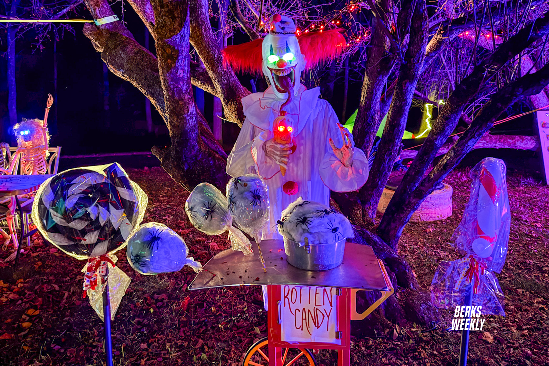 51020 Hartman Road, Exeter Township – This massive display offers visitors a walking path past themed areas that include a graveyard, evil pumpkin patch, and nearly a dozen skeletons. A talking skeleton adds entertainment out front. The Hartman Road homeowners also started the Creepin’ For Critters fundraiser, which now includes other homes and supports the Animal Rescue League of Berks County.